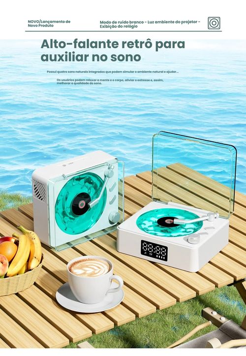Mini Caixa de Som Bluetooth Retrô com Relógio, Ruído Branco de Mar e Projeção, Presente Ideal